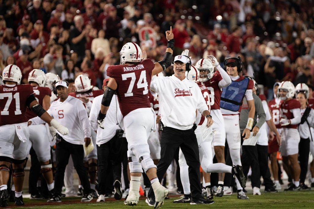 Stanford interim head coach Frank Reich celebrates with center Fisher Anderson (74) after Williams’ touchdown.