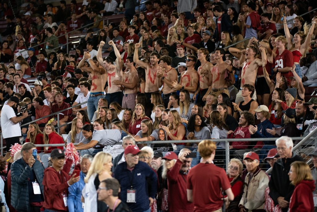 Cardinal fans cheer in the stands with alumni on the sidelines for the Reunion Homecoming game at Stanford.
