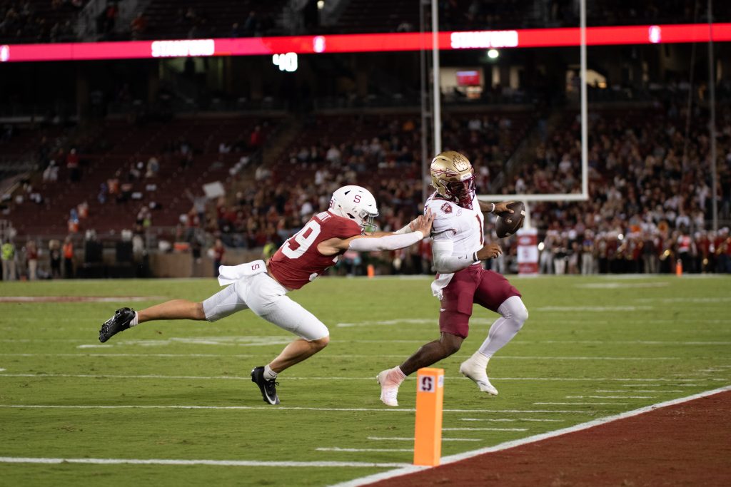 Cardinal safety Charlie Eckhardt (39) tries to force Florida State QB Tommy Castellanos (1) out of bonds.