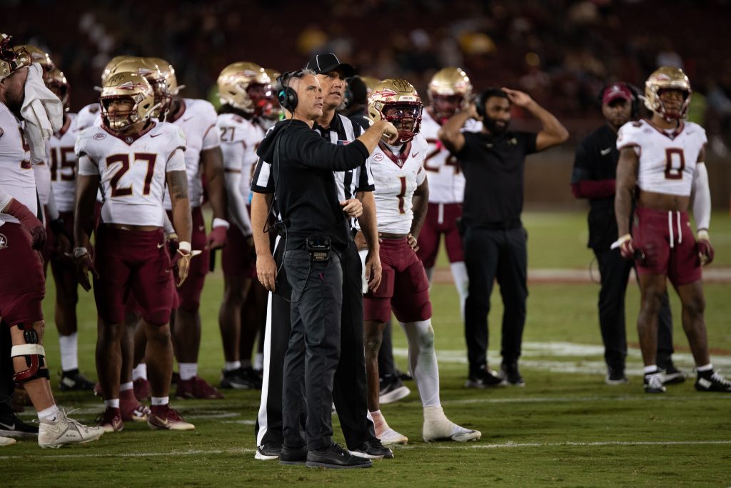 Florida State head coach Mike Norvell and Castellanos (1) look on while a play is under official review. The review upheld that Stanford’s defense stopped Castellanos just short on fourth-and-2.