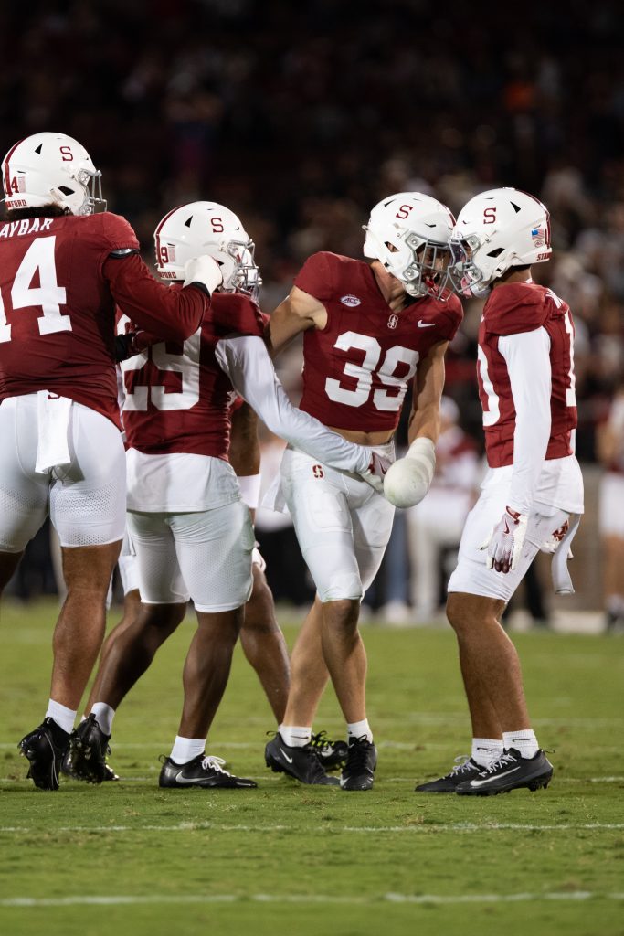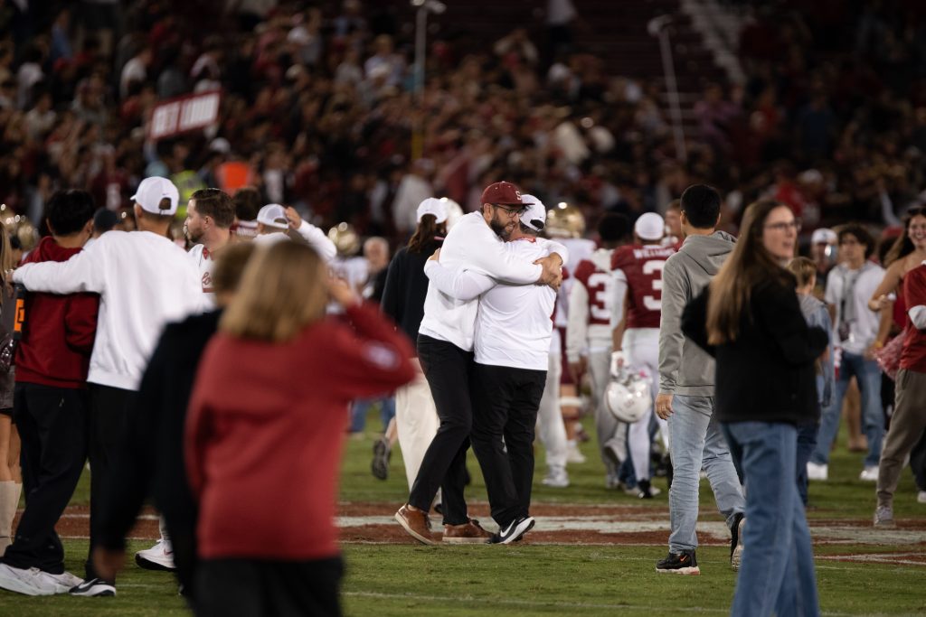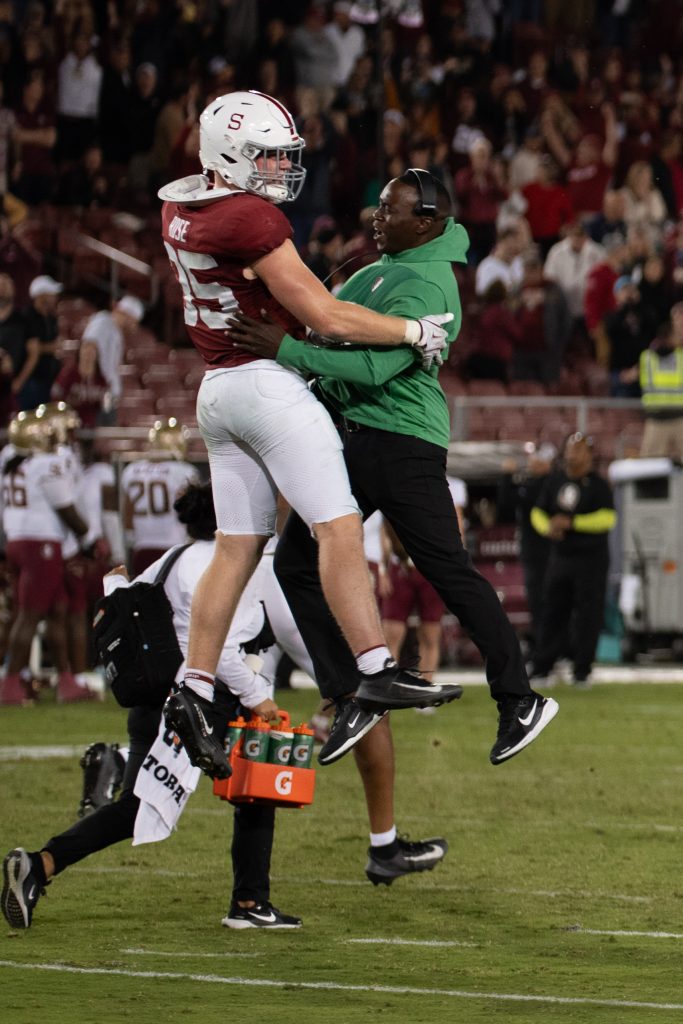 Stanford ILB Matt Rose (35) and defensive quality control analyst Jordan Holland celebrate after Stanford’s victory.