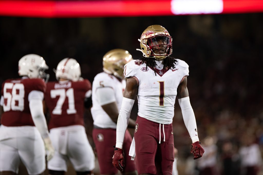 Seminole DB Shyheim Brown (1) looks on during the first half of the game.
