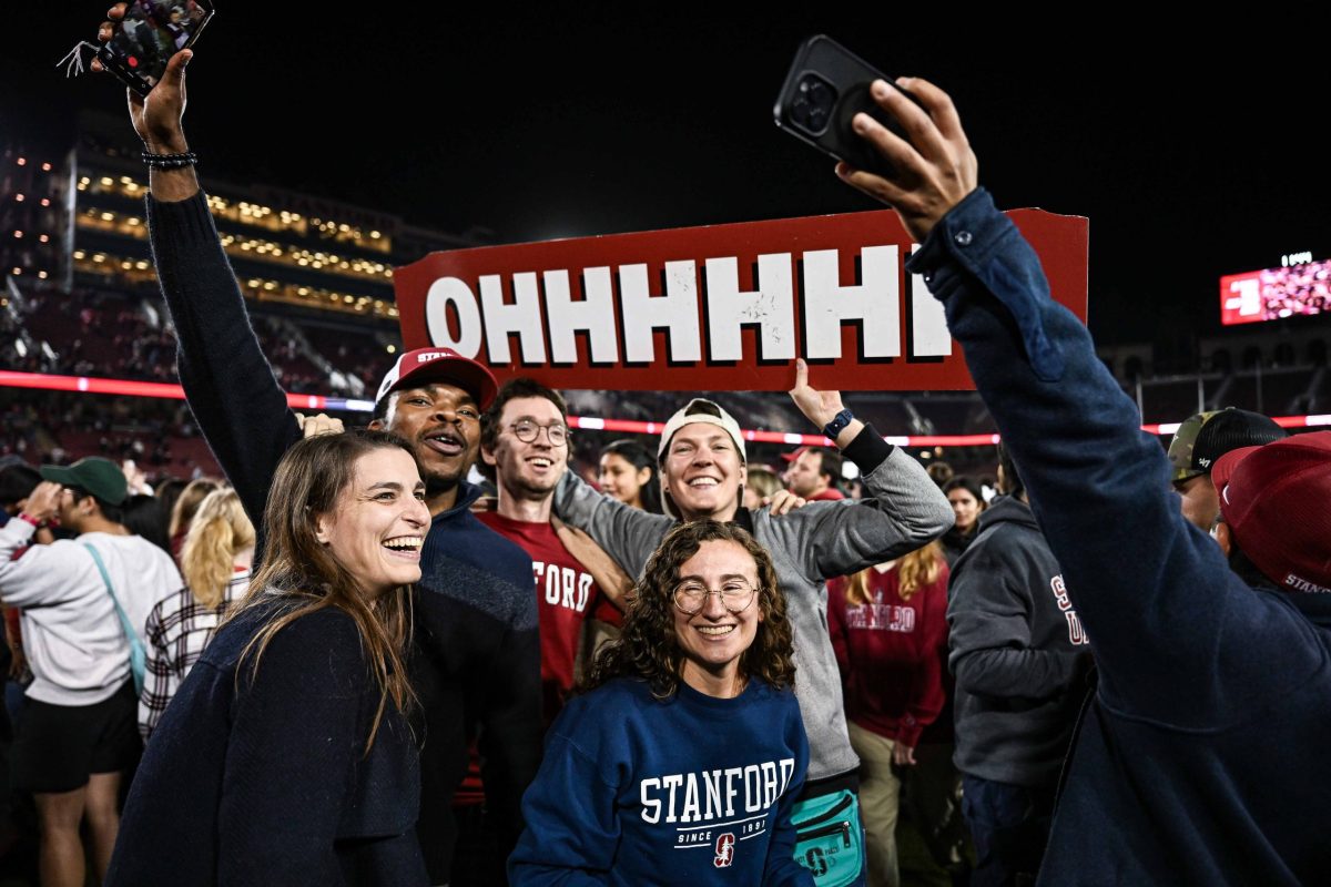 Stanford University students pose for a picture to celebrate the 31-10 victory during the 128th Big Game in Stanford, California on Nov 22, 2025. (Photo by Ziyu Julian Zhu/Peninsula Press)