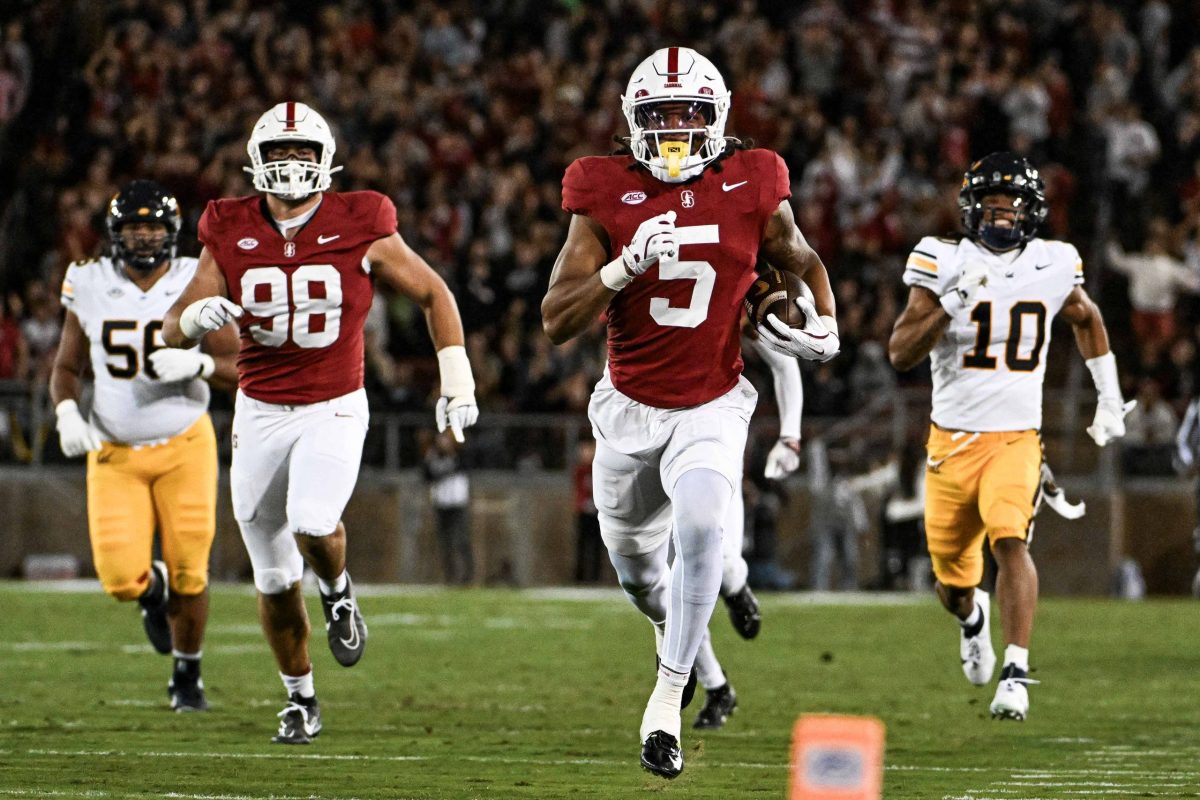 Jay Green (5) of Stanford Cardinal Football made the first touchdown during the 128th Big Game in Stanford, California on Nov 22, 2025. (Ziyu Julian Zhu/Peninsula Press)