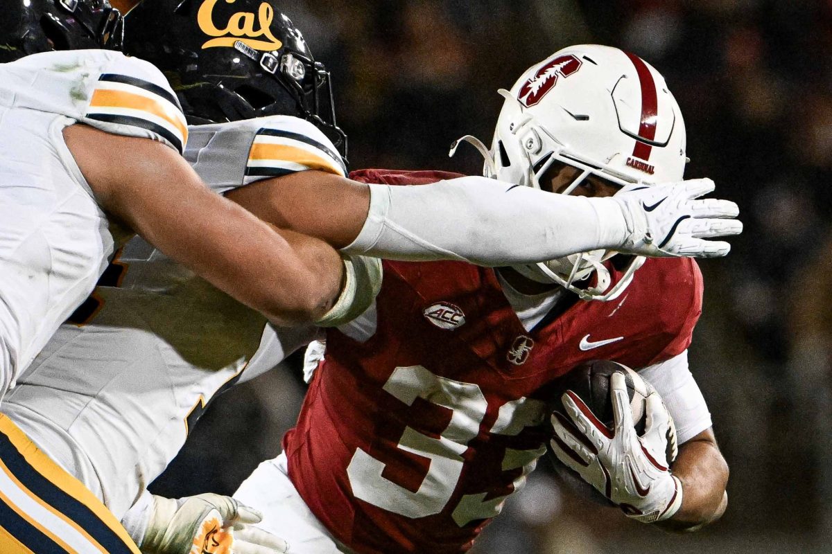 Cole Tabb (33) of the Stanford Cardinal Football attempts to break opponents' defence during the 128th Big Game in Stanford, California on Nov 22, 2025. (Ziyu Julian Zhu/Peninsula Press)