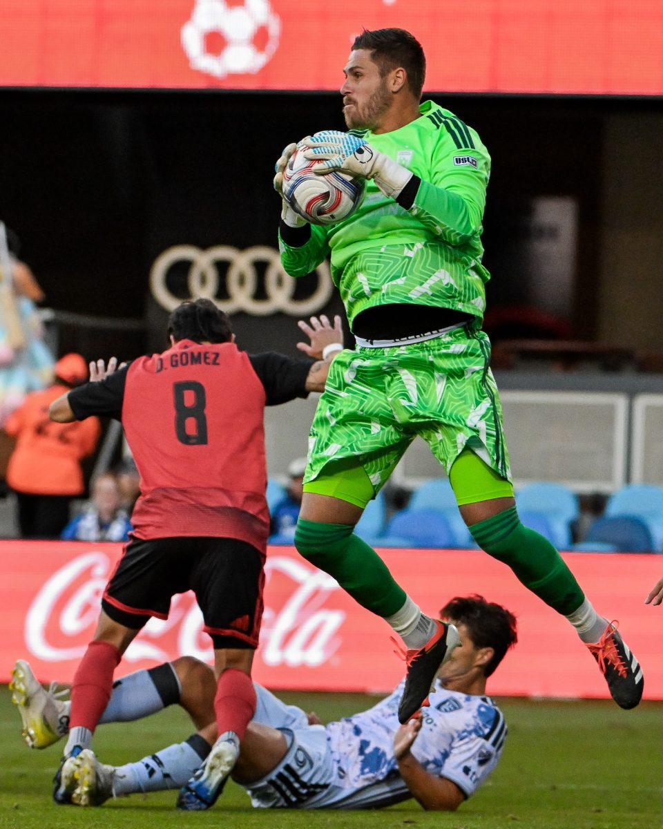 Caption: Phoenix Rising FC goalkeeper Patrick Rakovsky (1) competes during a match between San Jose Earthquakes and Phoenix Rising FC at PayPal Park in San Jose, California on Wednesday, April 15, 2026. (Photo by Ziyu Julian Zhu/Peninsula Press)