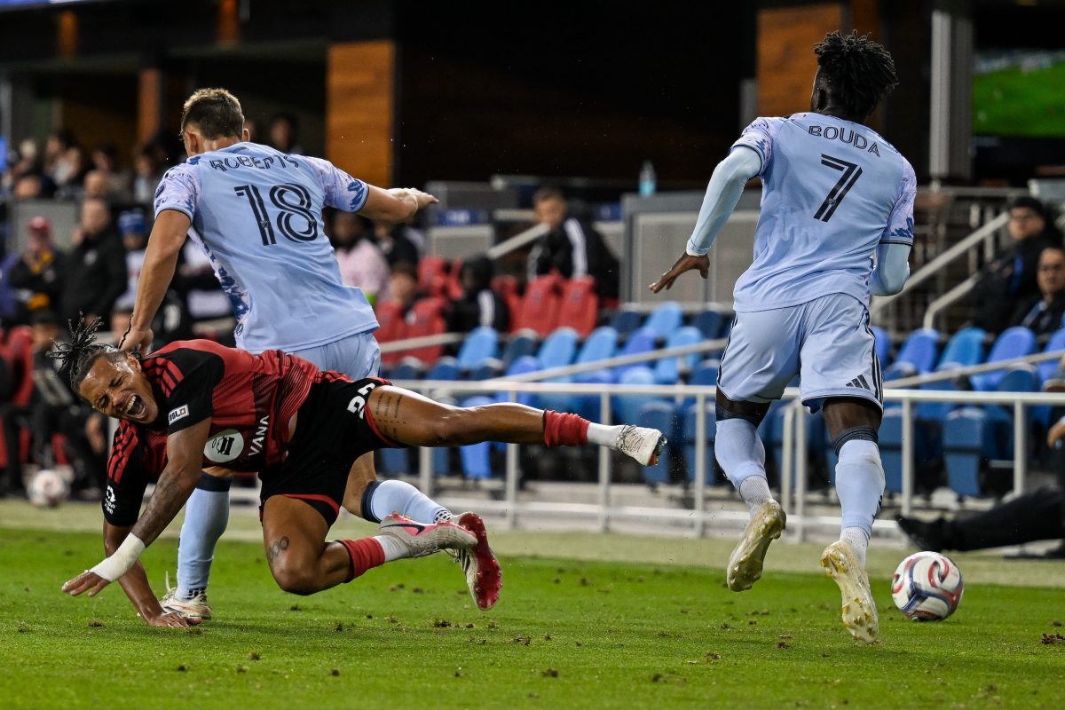 San Jose Earthquakes forward Ousseni Bouda (7), (from right), and San Jose Earthquakes defender Reid Roberts (18) compete during a match between San Jose Earthquakes and Phoenix Rising FC at PayPal Park in San Jose, California on Wednesday, April 15, 2026. (Ziyu Julian Zhu/Peninsula Press)