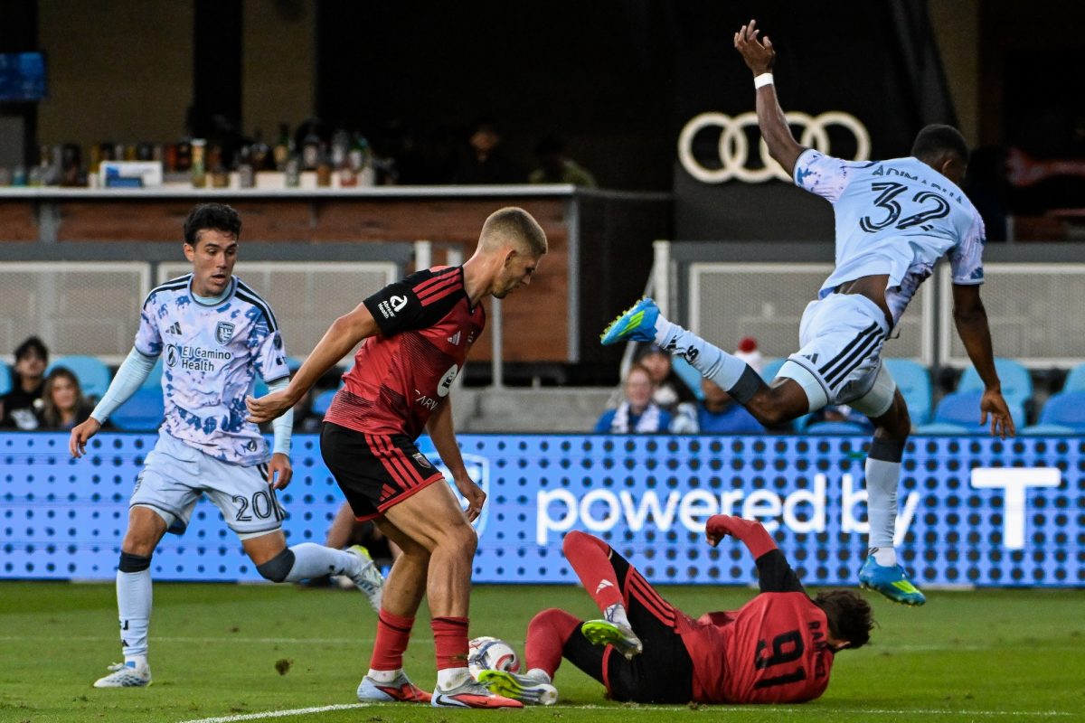 San Jose Earthquakes forward Nonso Adimabua (32), (right), competes during a match between San Jose Earthquakes and Phoenix Rising FC at PayPal Park in San Jose, California on Wednesday, April 15, 2026. (Ziyu Julian Zhu/Peninsula Press)