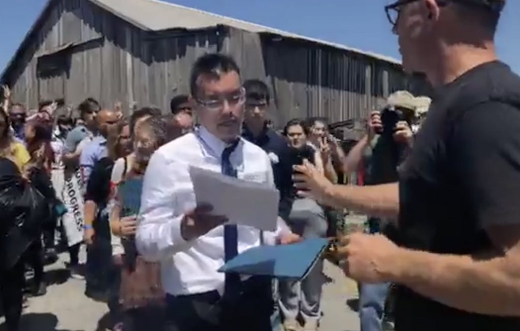 Protests began on a spring day in 2018. Around 500 demonstrators led by DxE protested outside Weber Family farms in Petaluma, Calif. Dozens of activists removed chickens they described as sick or dying. Weber Family Farms says the group’s allegations of animal cruelty are untrue.